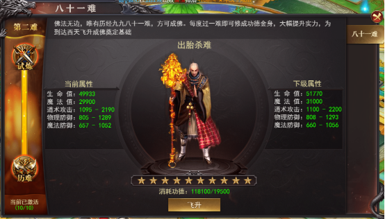 1:消耗对应的功德进行飞升,功德可以通过打怪获取